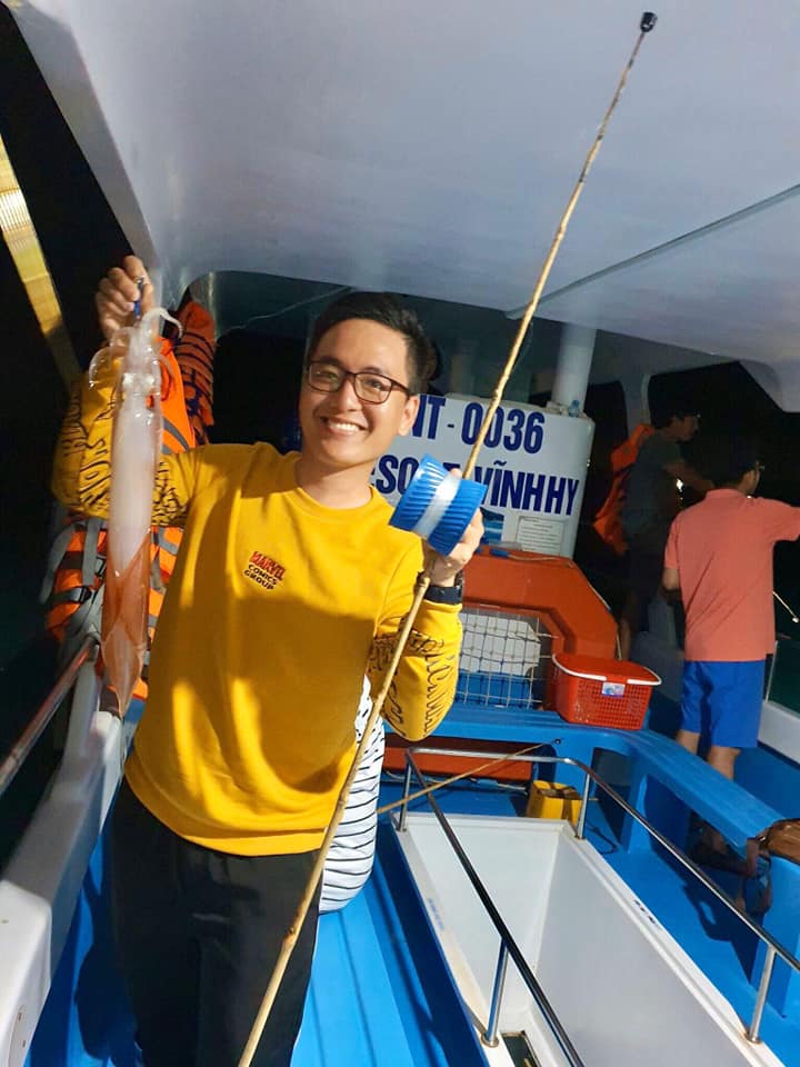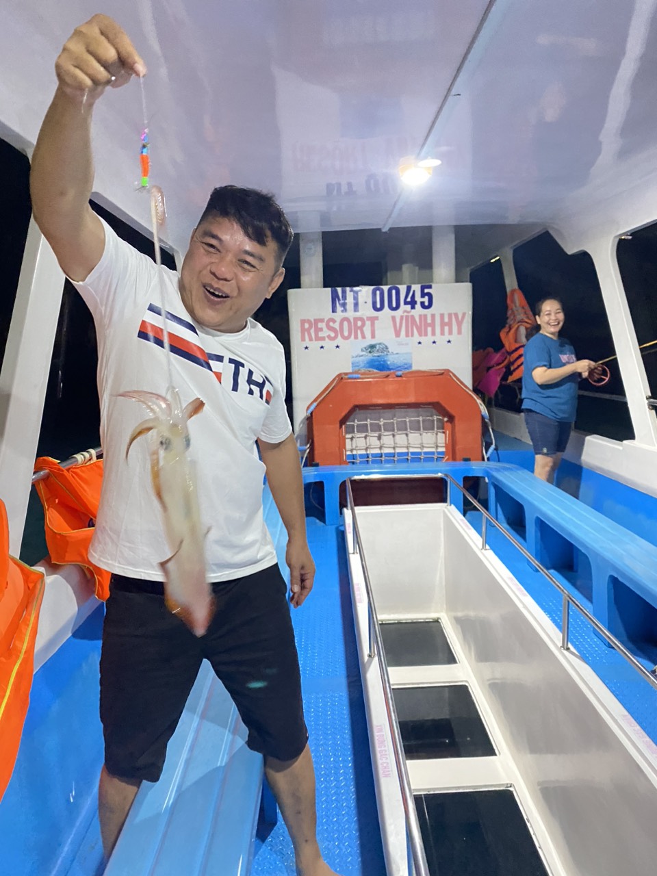 Giây phút thả câu và chờ đợi cùng những tiếng reo hò, thích thú khi câu được những con mực tươi rói là những trải nghiệm khó quên trong chuyến du lịch Vĩnh Hy, Ninh Thuận.